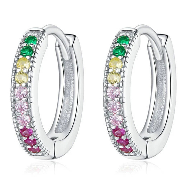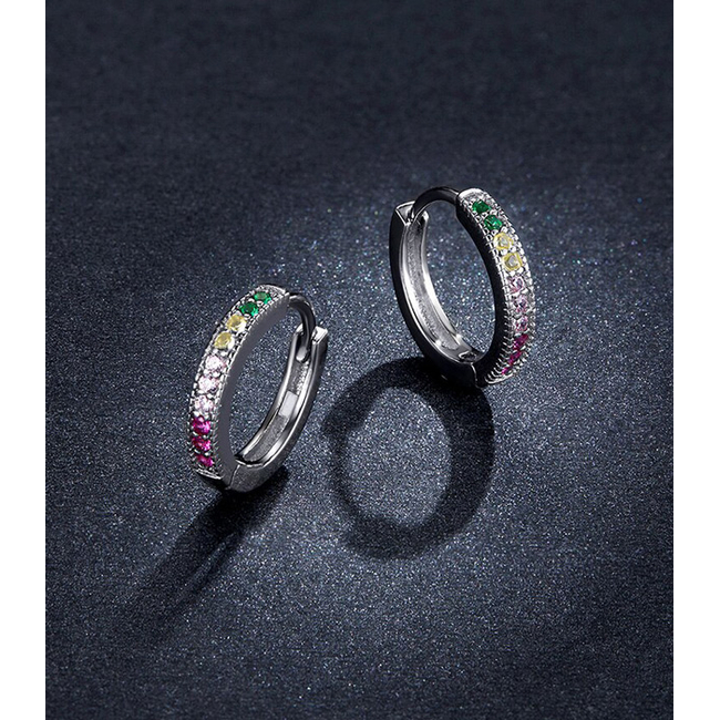 Εντυπωσιακά σκουλαρίκια κρίκοι, σε ασημί χρώμα, διακοσμημένο με κυβική ζιρκόνια σε εντυπωσιακά χρώματα που προσφέρει εξαιρετική λάμψη στο κόσμημα.