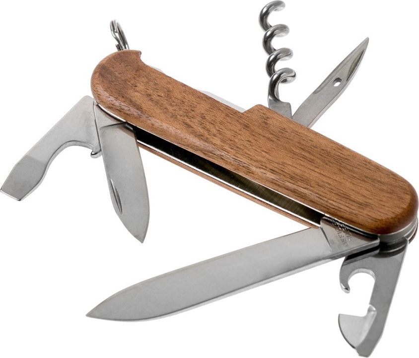 ToolsLarge blade; Small blade; Corkscrew; Reamer, punch and sewing awl; Key ring; Can opener with 3 mm screwdriver; Bottle opener with 6 mm screwdriver and wire stripper