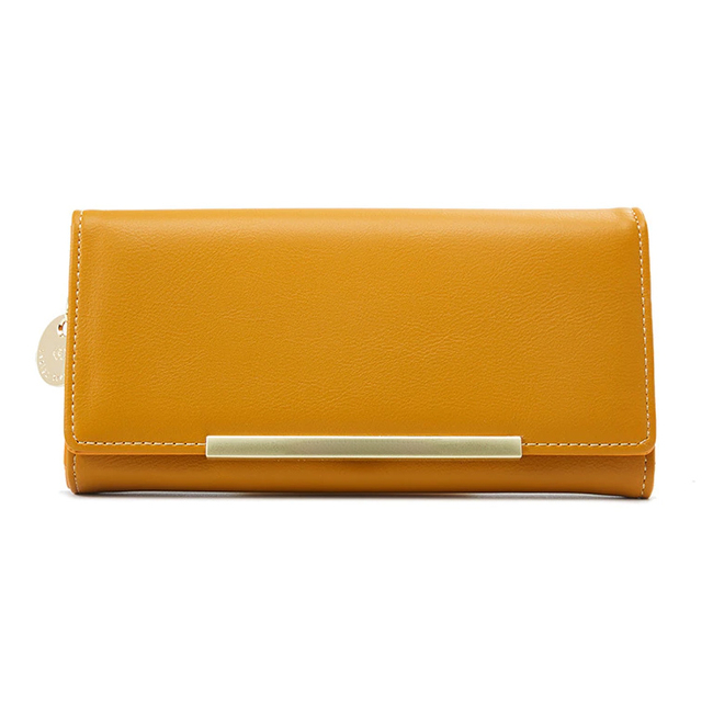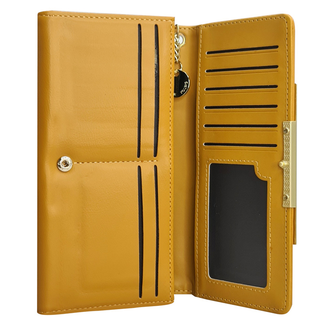 Κομψό, υψηλής ποιότητας γυναικείο πορτοφόλι σε κίτρινο χρώμα με χρυσές λεπτομέρειες. Διαθέτει πολλαπλές θέσεις στο εσωτερικό του για χαρτονομίσματα, 2 μέρη με φερμουάρ για ψιλά και 14 θέσεις για κάρτες.