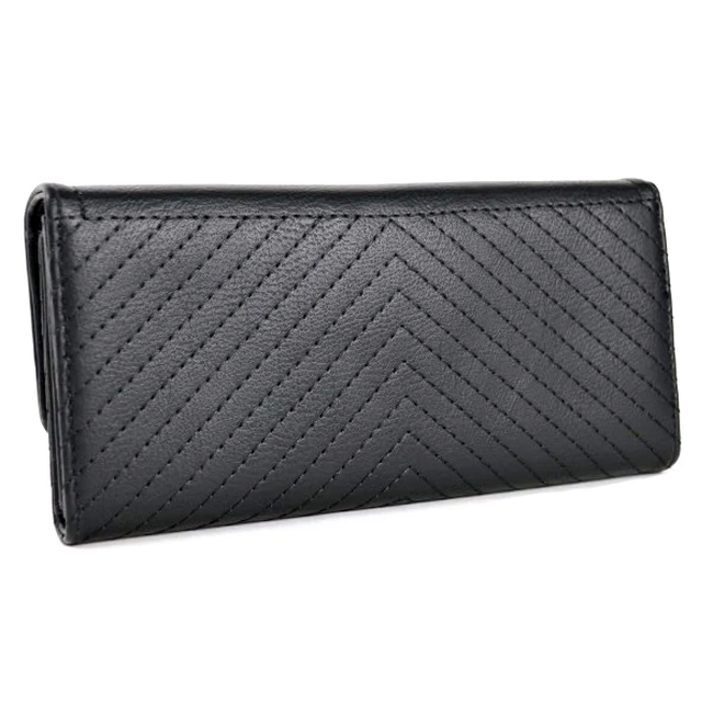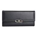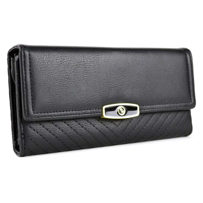 Κομψό, υψηλής ποιότητας γυναικείο πορτοφόλι σε μαύρο χρώμα με χρυσές λεπτομέρειες. Διαθέτει πολλαπλές θέσεις στο εσωτερικό του για χαρτονομίσματα, θέση με φερμουάρ για ψιλά και 10 θέσεις για κάρτες.
