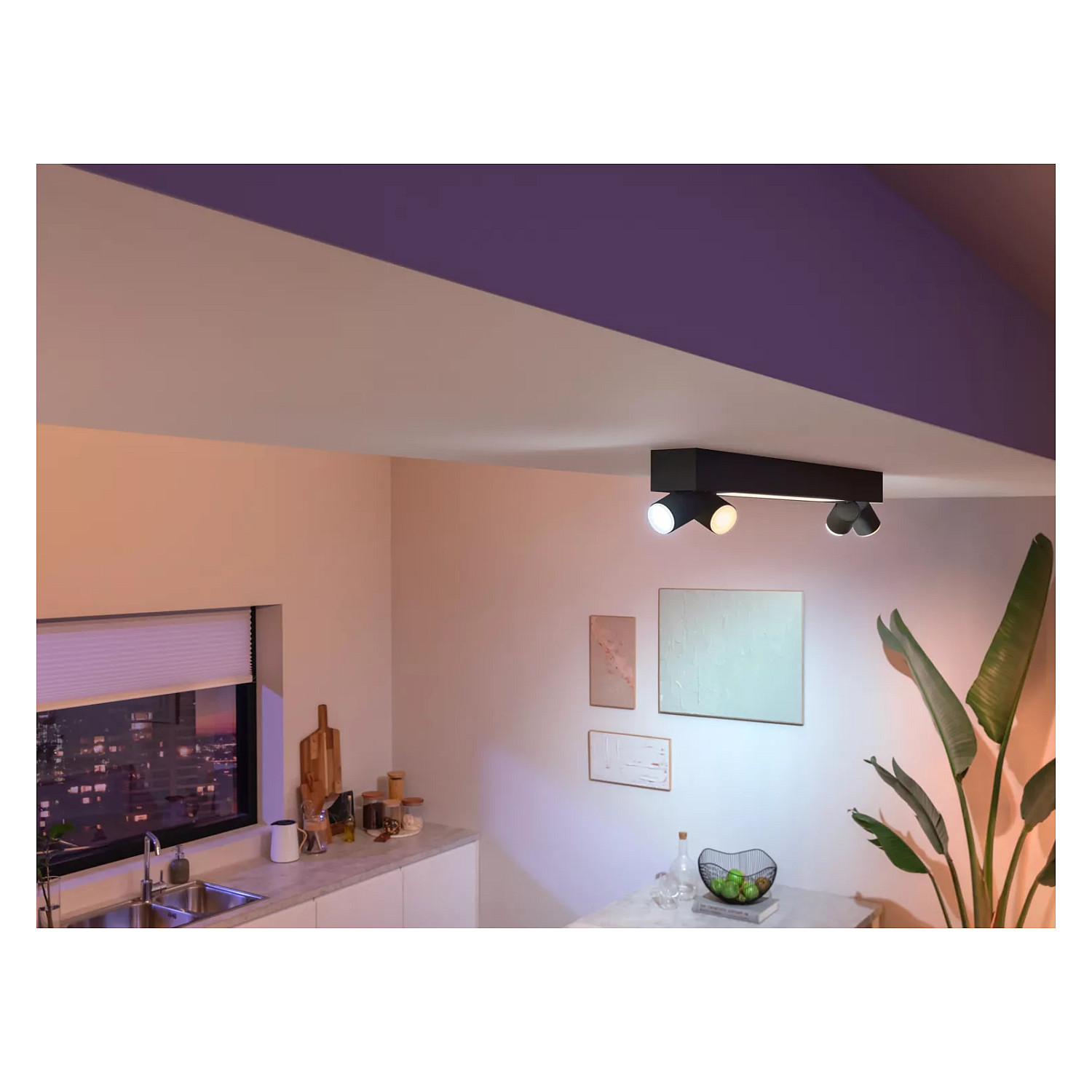 The Philips Hue White & Color Ambiance Centris Spot 4flg schwarz V2 is an innovative smart ceiling spotlight fixture designed to enhance your living spaces. Combining a fixed central LED bar with four adjustable color spots, this fixture offers versatile lighting options for various atmospheres.