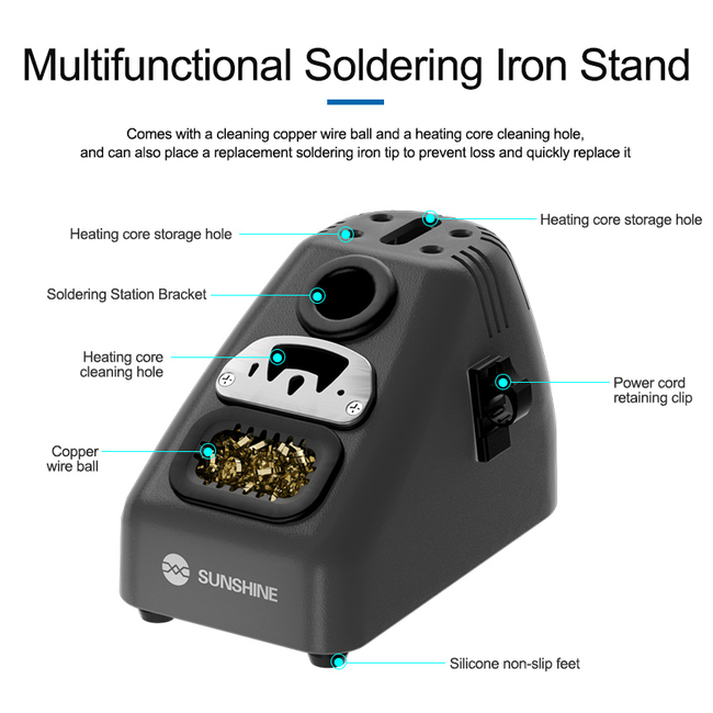 Σταθμός κόλλησης της Sunshine με υψηλή ισχύ 110W. Ενσωματώνει βάση για κολλητήρι και για συρμάτινο σφουγγάρι, αλλά και αποθηκευτικό χώρο για τοποθέτηση των μυτών κολλητηρίου. Επιπλέον, διαθέτει εύκολο σύστημα αλλαγής μύτης, που επιτρέπει την αλλαγή της ακόμη και όταν η μύτη είναι ζεστή.