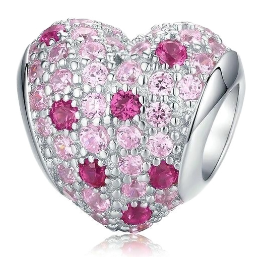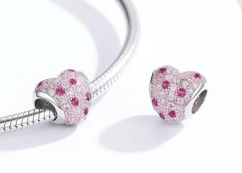 Υπέροχο charm τύπου Pandora για βραχιόλι της Bamoer, με μοντέρνο σχεδιασμό σε σχήμα καρδιάς, κατασκευασμένο από ασήμι 925, διακοσμημένο με αστραφτερή κυβική ζιρκόνια ροζ χρώματος.