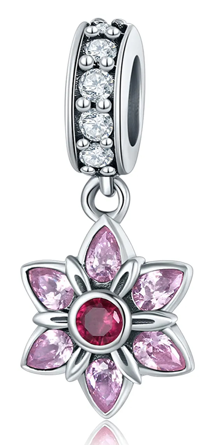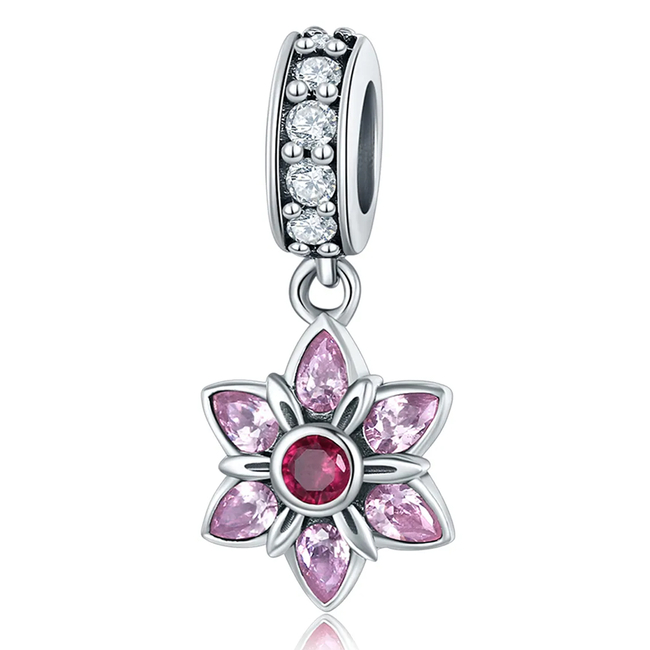 Υπέροχο charm τύπου Pandora, για βραχιόλι/κολιέ της Bamoer, με μοντέρνο σχεδιασμό σε σχήμα λουλουδιού, κατασκευασμένο από ασήμι 925, διακοσμημένο με αστραφτερή κυβική ζιρκόνια λευκού και ροζ χρώματος.