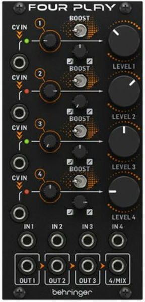 The Behringer FOUR PLAY is a compact and versatile Eurorack module designed as a 4-channel voltage-controlled amplifier (VCA) and mixer. This module stands out due to its four independent VCAs, each equipped with its own modulation input, allowing users to harness modulation for either amplitude or frequency control. This feature provides users with the ability to utilize the VCAs separately or merge them into a voltage-controlled mixer.