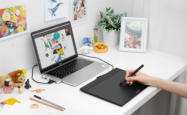 This tablet's plug-and-play design allows for immediate use without complicated setups. It is ideal for various applications, including digital drawing, painting, and photo editing. Its lightweight stylus features two buttons and the tablet surface has anti-slip feet for stable usage.
