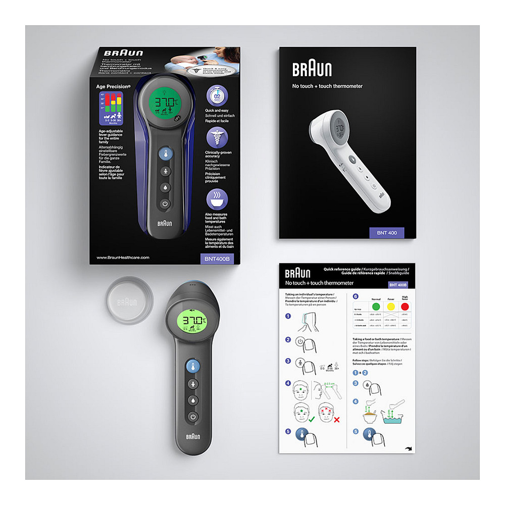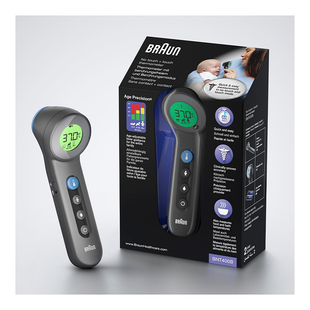 The Braun BNT400 BK Fernabtastthermometer is a cutting-edge thermometer designed for both no-touch and touch measurements. It features innovative Age Precision technology that assists in age-adjusted fever guidance. You can switch between measurement modes effortlessly, allowing for precise readings in just 2 seconds.