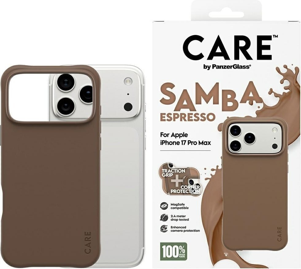 The CARE by PanzerGlass Fashionable Samba MagSafe case for iPhone 17 Pro Max in Espresso is a stylish and sustainable choice for protecting your device. Made from 100% recycled thermoplastic polyurethane (TPU), it showcases environmental responsibility along with robust protection.