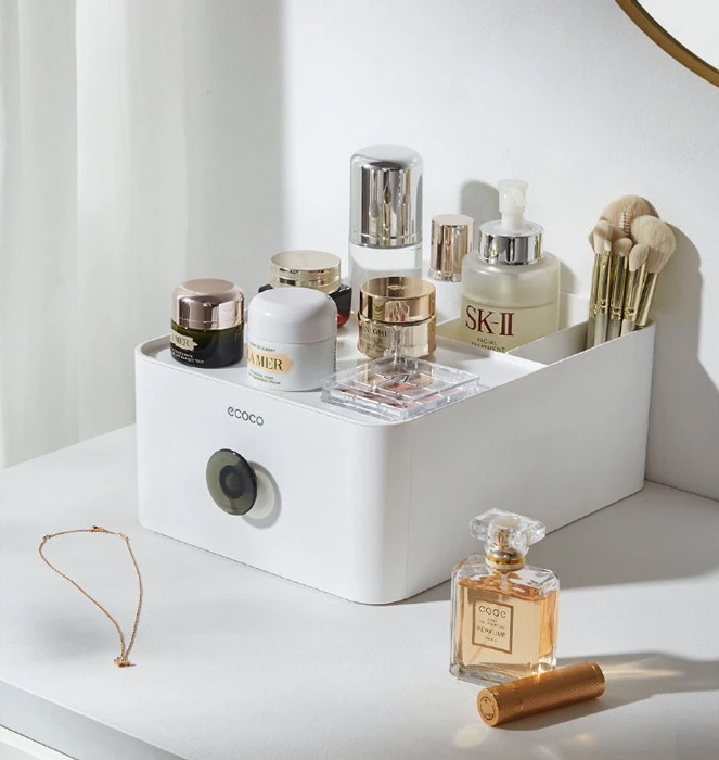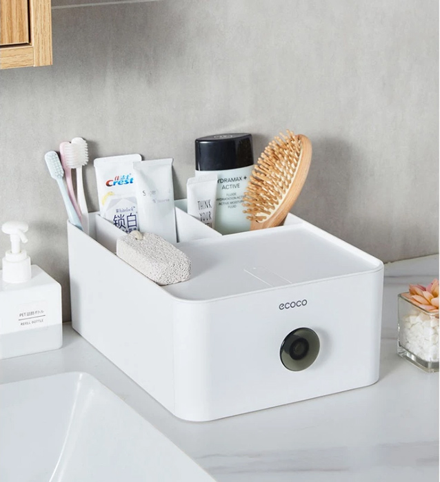 Πολυχρηστική θήκη οργάνωσης αντικειμένων της ECOCO. Εξοπλίζεται με συρτάρι, stand για smartphone και 3 ανοιχτά διαμερίσματα αποθήκευσης τα οποία μπορούν να προσαρμοστούν ανάλογα με τις ανάγκες σας, καθώς τα διαχωριστικά τους είναι μετακινούμενα και αφαιρούμενα.