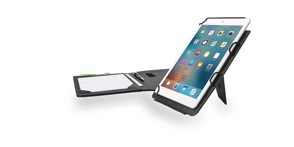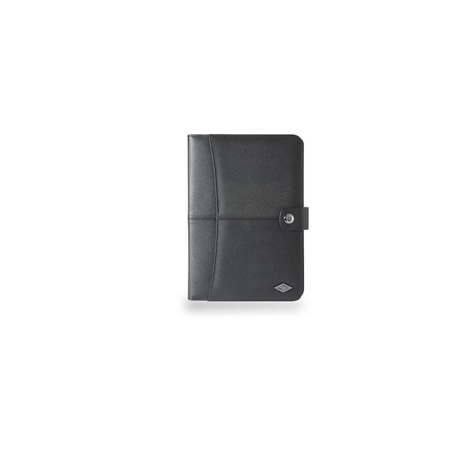 - Magnetic closure with retractable strap, detachable tablet holder with cut-outs for lenses, foldable presentation stand, A5 document pocket, card compartments, pen loop, A5 writing pad