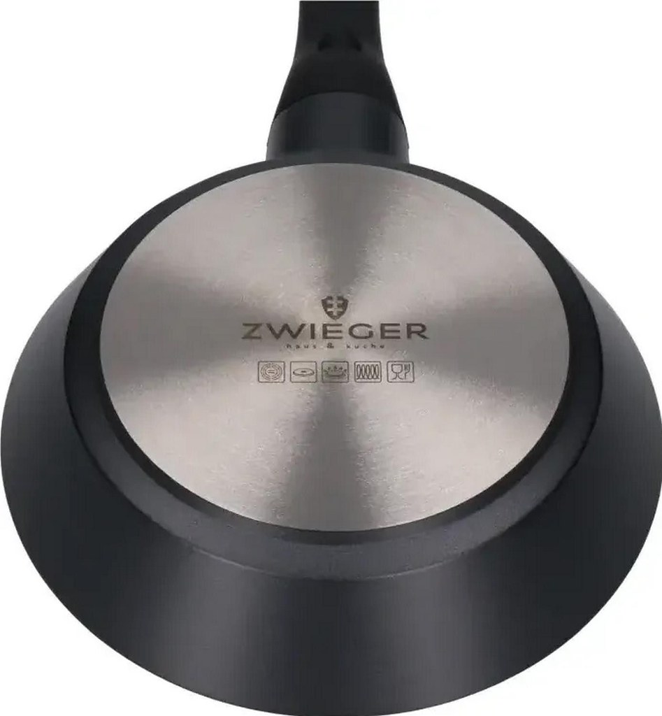 The Zwieger Black Stone 28 cm Black frying pan is crafted from die-cast aluminum, ensuring high durability and stability in temperature. This method also guarantees resistance to deformation during long-term use.