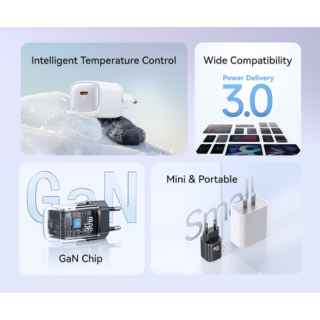 The USAMS CC251 30W charger is a revolutionary solution in the field of powering mobile devices. The use of GaN technology allows for a significant reduction in the size of the charger while increasing its efficiency.
