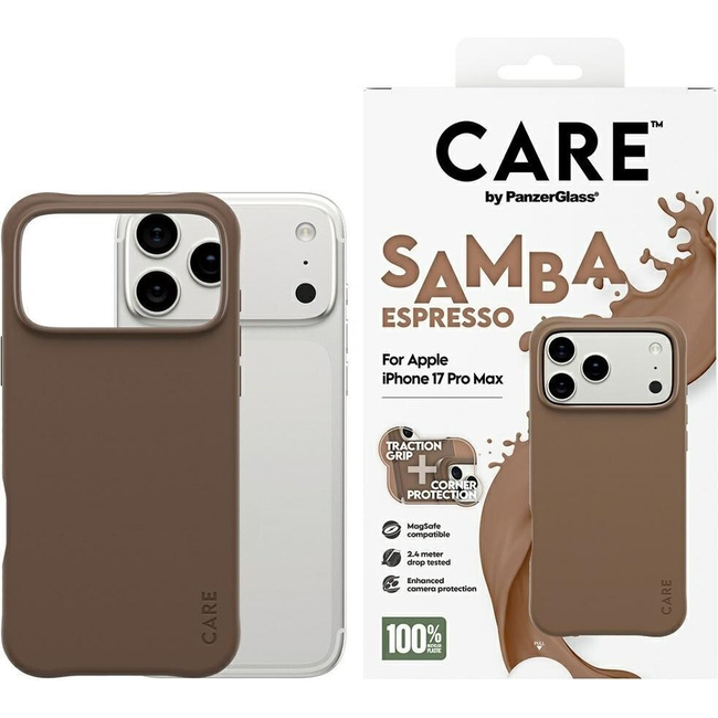 The CARE by PanzerGlass Fashionable Samba MagSafe case for iPhone 17 Pro Max in Espresso is a stylish and sustainable choice for protecting your device. Made from 100% recycled thermoplastic polyurethane (TPU), it showcases environmental responsibility along with robust protection.