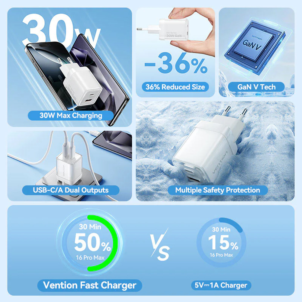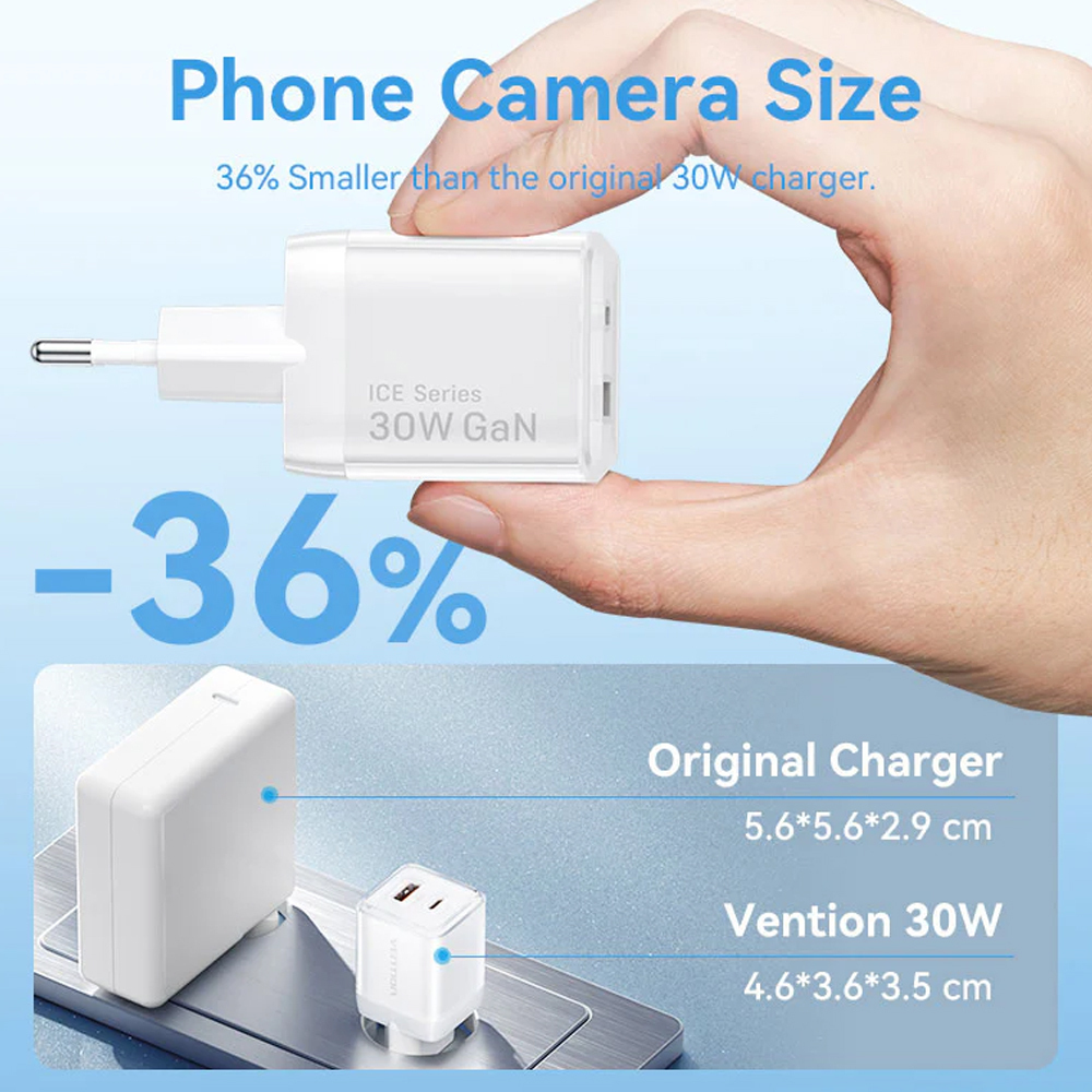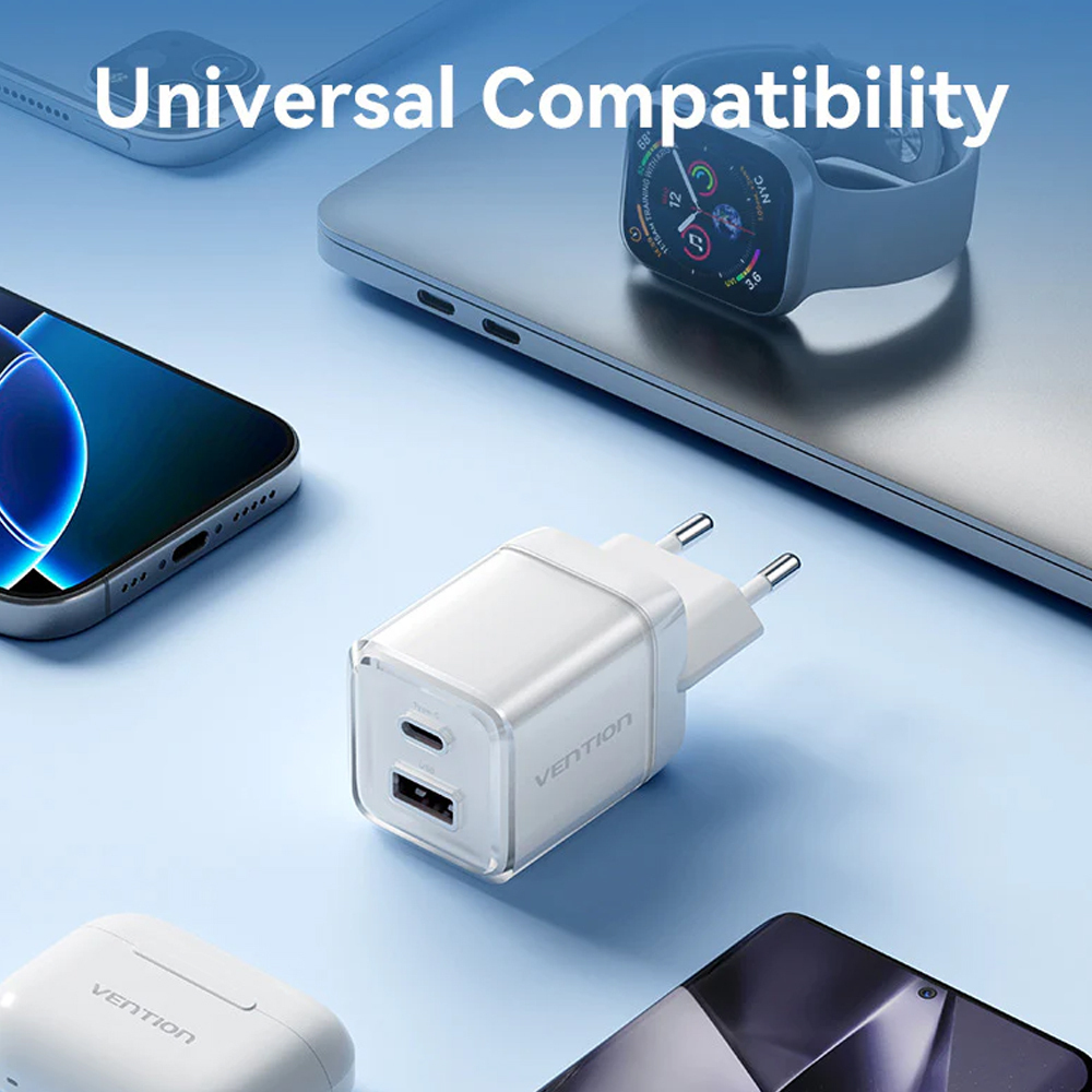 VENTION GaN 2 Port USB C A Charger 30W with 1m USB C to USB C Cable EU Pink