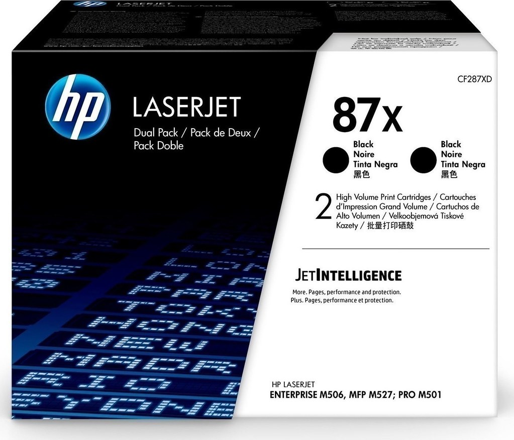 The Toner HP Cartridge No 87X Black (CF287XD) is an original high-yield black laser toner cartridge designed for professional-quality black and white printing. It comes in a 2-pack configuration that delivers up to 18,000 pages per cartridge, resulting in a total yield of 36,000 pages. This makes it ideal for high-volume environments where reliability and print quality are critical.