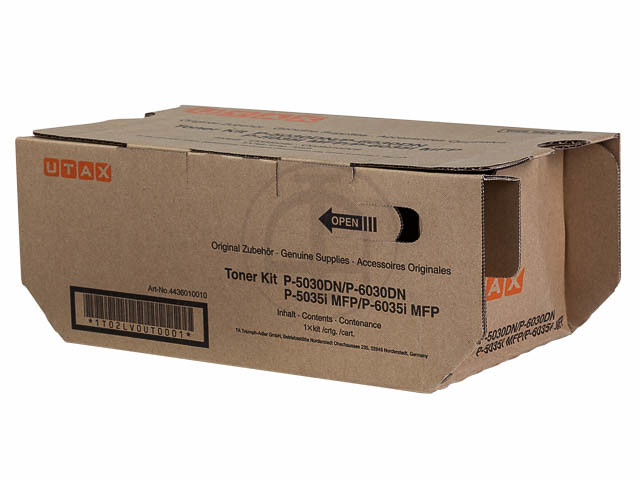 The Utax Toner 4436010010 is designed for use in specific Utax printers, including the P-5030DN, P-5035i MFP, P-6030DN, and P-6035i MFP, as well as their equivalent models under the Triumph-Adler brand. This toner cartridge is a black toner unit, providing a yield of approximately 25,000 pages, making it suitable for high-volume printing environments.