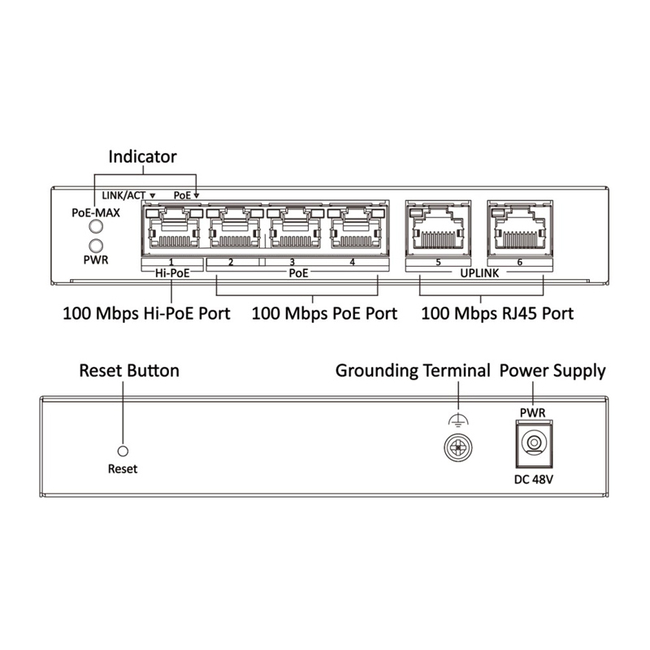 Port Number: 4x 100 Mbps PoE RJ45 port, and 2x 100 Mbps network RJ45 ports