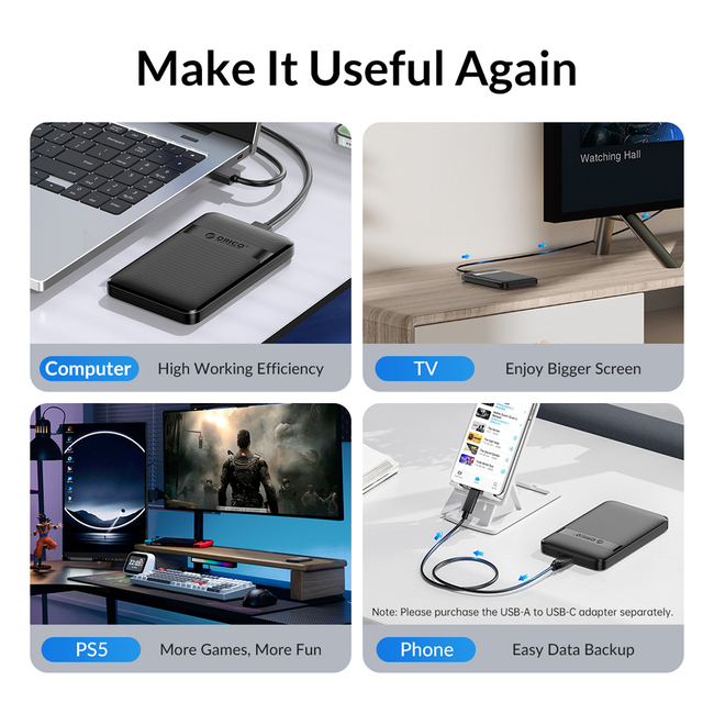 Η θήκη της ORICO επιτρέπει την σύνδεση ενός 2.5" SATA HDD ή SSD με έναν επιτραπέζιο ή φορητό υπολογιστή μέσω θύρας USB.