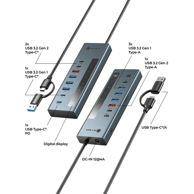 USB Hub Icy Box 9-In-1 Led With 2Xtype-C Pd100W 1Xtype-C Pd20W, 4XUSB3.2 & Type-C/USB