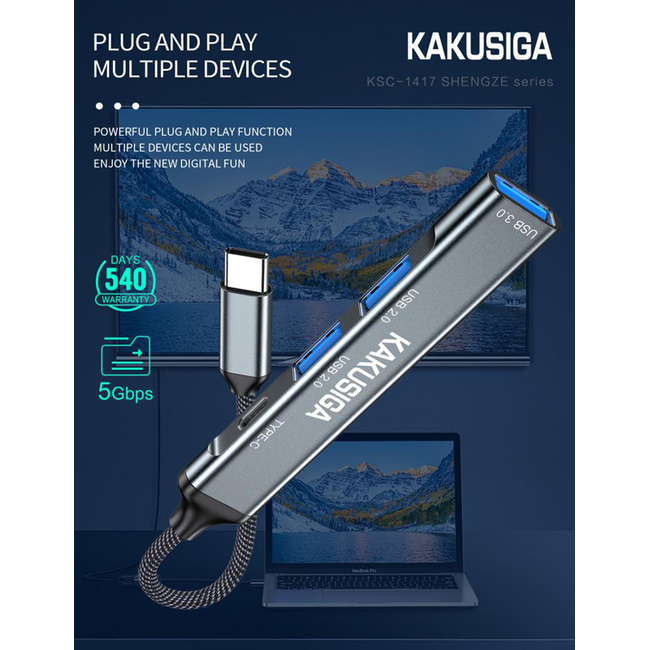 Αυτό το hub της KAKUSIGA μπορεί να συνδεθεί με το laptop ή το desktop σας μέσω θύρας USB-C και να επεκτείνει τις θύρες του με 1x USB-C και 3x USB θύρες. Διαφορετικές συσκευές USB, όπως εξωτερικοί σκληροί δίσκοι, card readers, ποντίκια κλπ. μπορούν να συνδεθούν μέσω του hub.