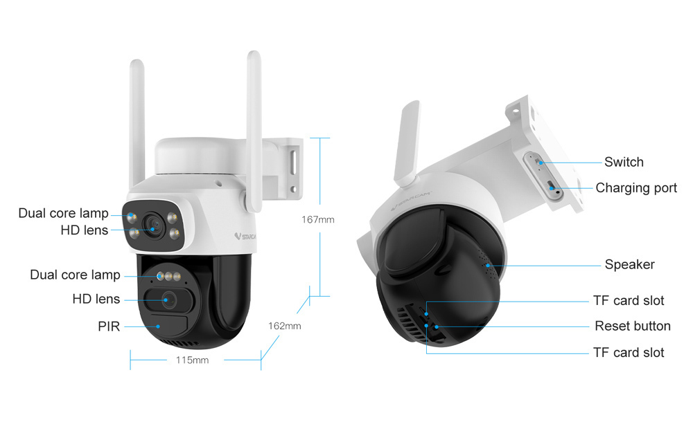 Ενσωματώνει 2 φακούς που επιτρέπουν μεγαλύτερη κάλυψη στον χώρο και υποστηρίζει PTZ λειτουργία που σας επιτρέπει την οριζόντια και κάθετη μετακίνηση της κάμερας μέσω της εφαρμογής.