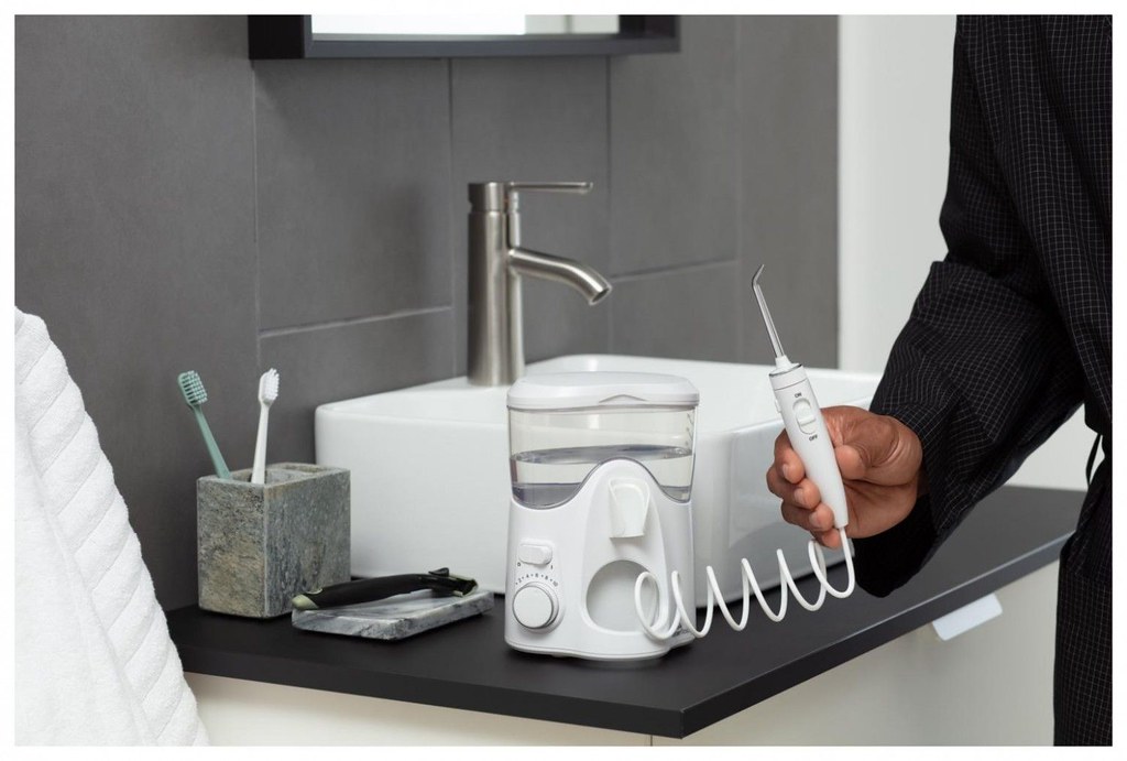 The Waterpik Water Flosser WF-150 White is an innovative countertop dental water flosser crafted to enhance your oral hygiene routine. Utilizing water pressure and pulsations, this device effectively removes plaque and other debris from your mouth.