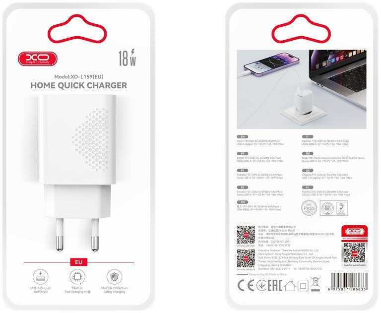 XO Charger USB A 18W White XO L159 EU QC3 0