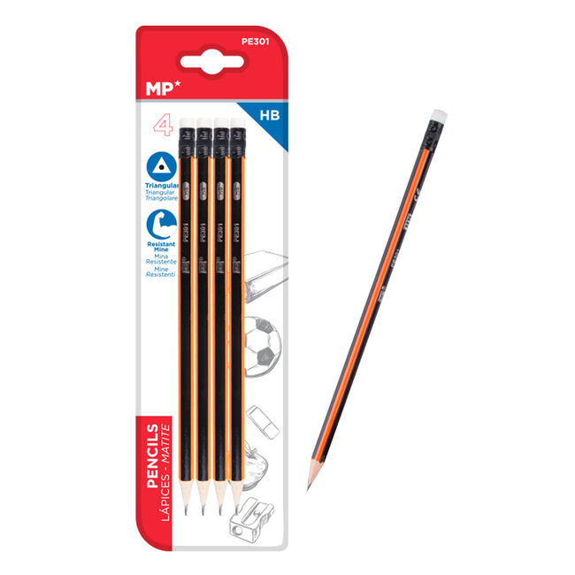 MP ξύλινο μολύβι με γόμα PE301, τρίγωνο, HB, 4τμχ
