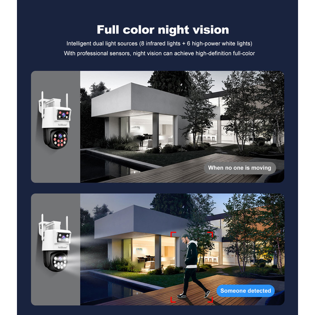 - Η προεπιλεγμένη είναι η νυχτερινή όραση σε ασπρόμαυρο. Όταν ανιχνεύεται ανθρώπινη μορφή, το λευκό φως θα ενεργοποιηθεί αυτόματα και θα μετατραπεί σε νυχτερινή όραση πλήρους χρώματος.