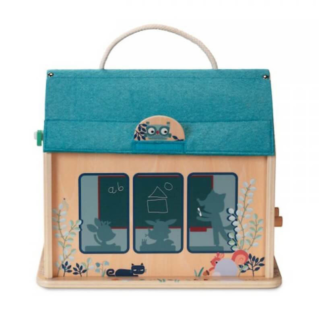 - 1 wooden schoolhouse with an openable felt roof, 3 wooden figures (2 students and 1 additional character), various educational accessories
