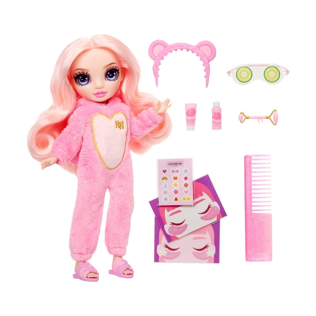 Η στολή της, η οποία περιλαμβάνει μια μαλακή ροζ φόρμα και αντίστοιχες ροζ παντόφλες, είναι ιδανική για ένα άνετο πάρτι πιτζάμας. Αυτή η κούκλα είναι πλήρως άρθρωτη και ποζάρεται, κάνοντάς την ευέλικτη για διάφορα σενάρια. Τα θεματικά αξεσουάρ της Bella περιλαμβάνουν: