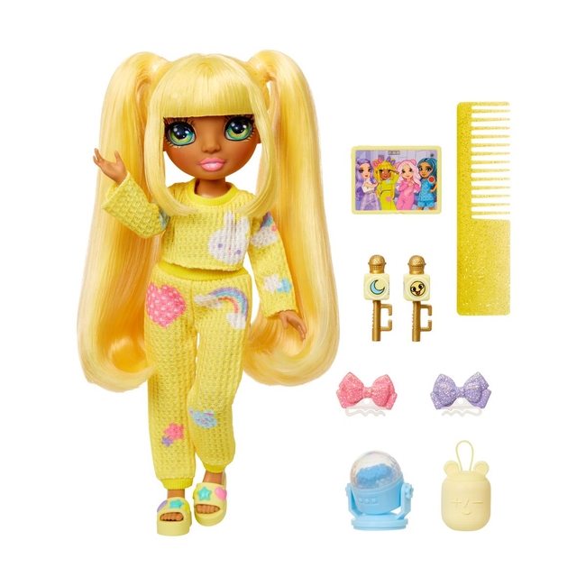 - Complete pajama outfit, Pair of doll slippers, 2 microphones, Portable speaker, Disco light, Yellow tablet, 2 chair clips, Doll comb