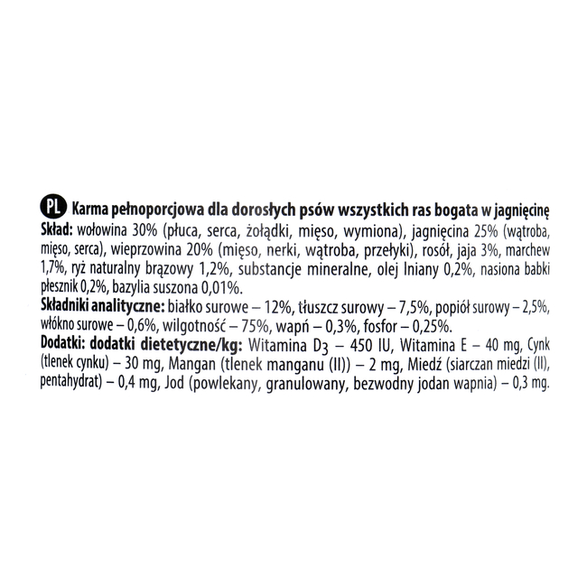 - Beef 30% (lungs, hearts, gizzards, meat, udders), lamb 25% (liver, meat, hearts), pork 20% (meat, kidneys, liver, oesophagus), broth, eggs 3%, carrots 1.7%, natural brown rice 1.2%, minerals, linseed oil 0.2%, Psyllium seed 0.2%, dried basil 0.01%.