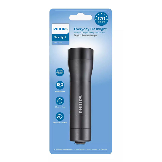 Ελαφρύς και φορητός φακός LED SFL4001T απο την Philips. Ο LED φακός καθημερινής χρήσης, καλύπτει τις ανάγκες σας για φως μέσα αλλά και έξω από το σπίτι. Ιδανική λύση για να τον έχετε πάντοτε κοντά σας μέσα στο σπίτι ή στην εργαλειοθήκη σας. Το μικρό του μέγεθος τον καθιστά εύχρηστο και λειτουργικό κάτω απο όλες τις συνθήκες. Τεχνολογία LED που παρέχει άπλετο φως με ελάχιστη κατανάλωση. Παρέχει φωτεινότητα 170 lumens με έως και 6 ώρες αυτονομίας με 4 μπαταρίες ΑΑA (συμπεριλαμβάνονται στην συσκευασία). Ελαφρύς και ανθεκτικός, φτιαγμένος απο κράμα αλουμινίου και με πιστοποίηση IPX4 για να αντέχει σε νερό και υγρασία. Η ακτίνα του μπορεί να φωτίσει έως και τα 180 μέτρα.