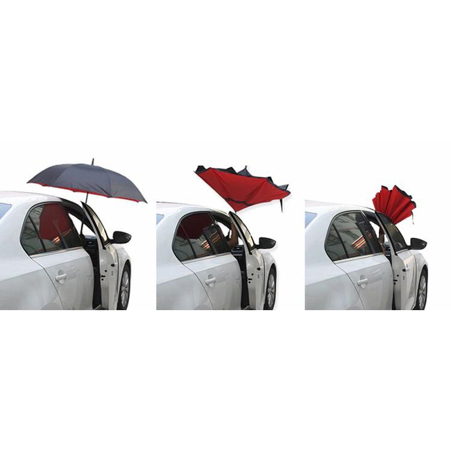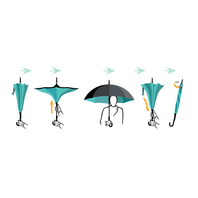 Η καινοτόμα ομπρέλα αντίστροφης δίπλωσης ανοίγει και κλείνει ανάποδα, παγιδεύει το νερό στο εσωτερικό της και αφήνει εξωτερικά, τη στεγνή πλευρά του υφάσματος, εμποδίζοντας το νερό να στάζει. Με εύκολο άνοιγμα και κλείσιμο σε περιορισμένους χώρους, δεν θα ξανά βραχείτε ενώ μπαίνετε στο αυτοκίνητό σας ή το σπίτι σας ενώ παράλληλα τα διατηρείται στεγνά.