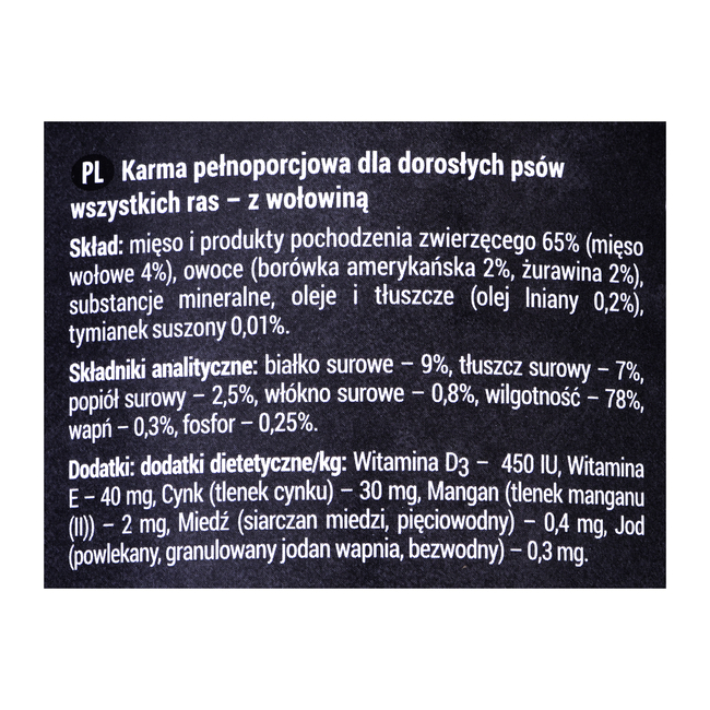 - meat and animal derivatives 65% (beef 4%), fruit (blueberry 2%, cranberry 2%), minerals, oils and fats (linseed oil 0.2%), dried thyme 0.01%.
