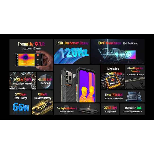 Με τριπλή 108MP κύρια, 5MP θερμική, 5MP micro κάμερα και εμπρόσθια 16MP κάμερα, μπορείτε να τραβήξετε εικόνες υψηλής ανάλυσης, με εξαιρετική σαφήνεια και ζωντανά φυσικά χρώματα. Χάρη στην αδιάβροχη προστασία του υποστηρίζει υποβρύχια λήψη φωτογραφιών και βίντεο.
